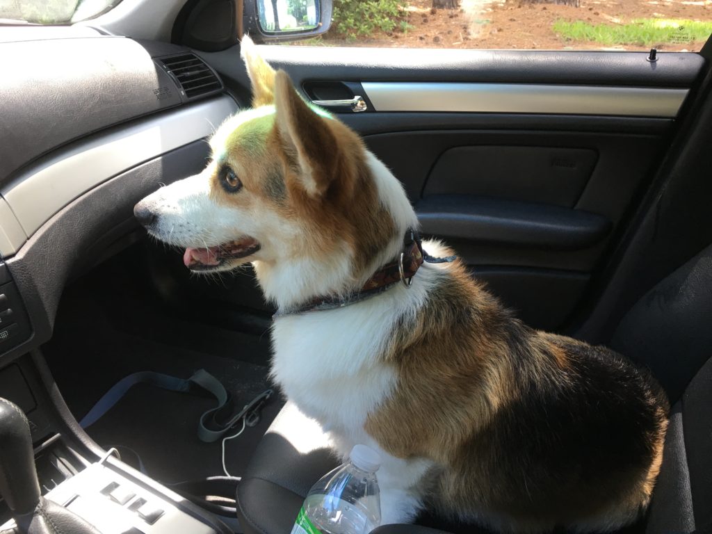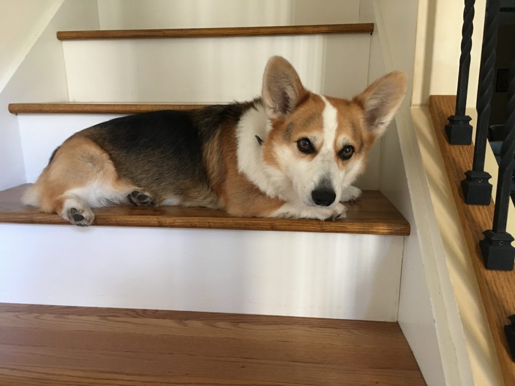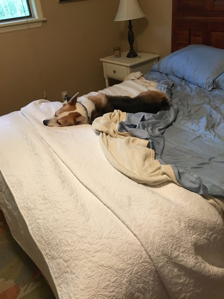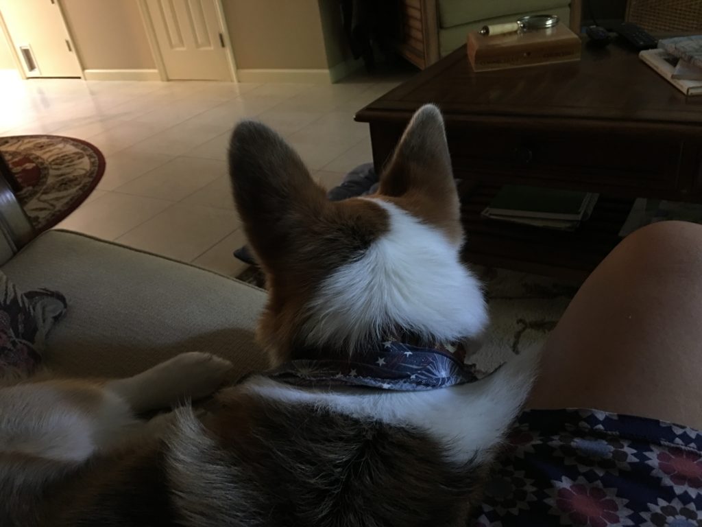 Monday, July 1, Day 2: Indy meet two other dogs at our community dog park through the fence, taking a good sniff of each and walking away as if to say “meh”. The leader made a huge difference in his behavior on the leash, virtually no pulling. We walked by some neighborhood cats and he wasn’t interested, He continues to be good with food and treats, only a few times being too excited and a stern “No” seems to work. He will let me pick him up and put him on the bed and accepts as much cuddling and belly rubbing as I’ll give, but once the attention stops he hops off the bed. He is showing the potential to be a “stalker dog” like our last corgi, Shelby, following me everywhere and not getting to far away.