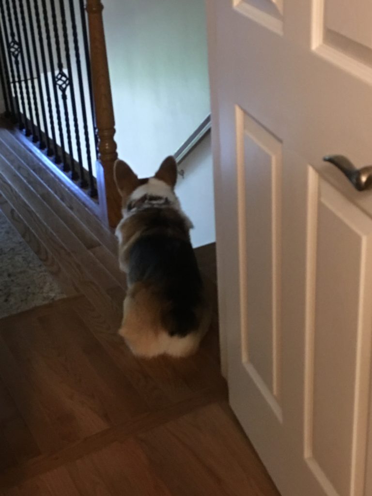 Thursday, July 4, Day 5: Indy continues to be a good boy and seems very fond of his new human brother,woofing at him if he doesn’t give him attention quickly enough. Indy discovered that if he sits on the steps he can see out the front door, leaving no passerby safe from a “Woof”.