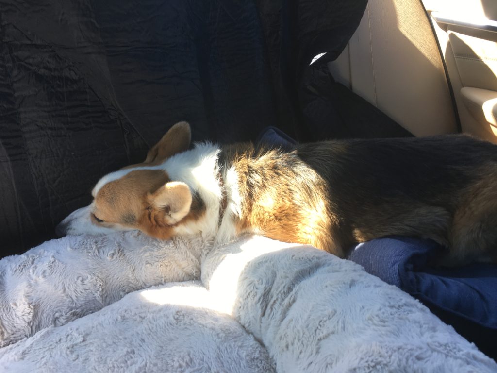 This trip took about 11 hours, and Indy was a good boy for the whole trip. He got out to potty and exercise at every stop, and made good use of the geocaching doggie bowl we have had since out GSD many years ago. The pacing was much diminished, but he really wanted to watch out the windows, and Ben believes that his inability to do this easily, being short and all, is part of his anxiety. I don’t know how to make looking out easier for him without compromising his safety, but if anyone has any suggestions, I’d much appreciate it.