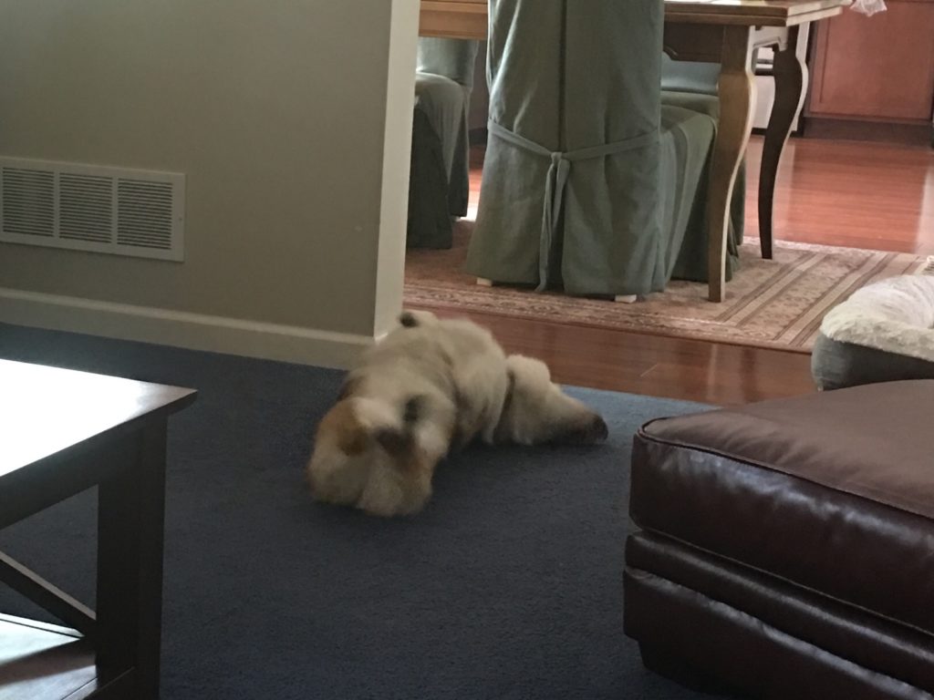 When we got to the house, Indy did not show much interest in being outside, but trotted right in through the door and started exploring his new digs. He wanted y’all to know that carpeted steps are sooo much easier to zoom up and down than those hard wood ones 🙂 This last photo is a bit blurry because it is an action photo taken when I thought my phone was set to video. I think Indy rolled around on the carpet in every room that had it. Guess he likes that soft stuff.