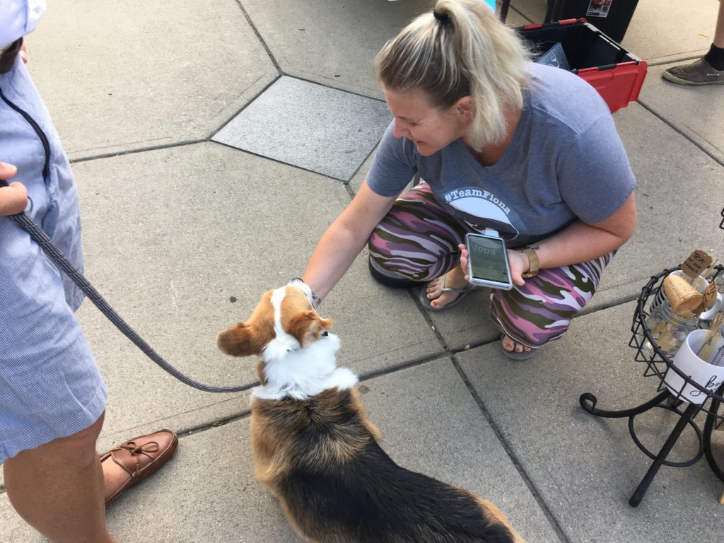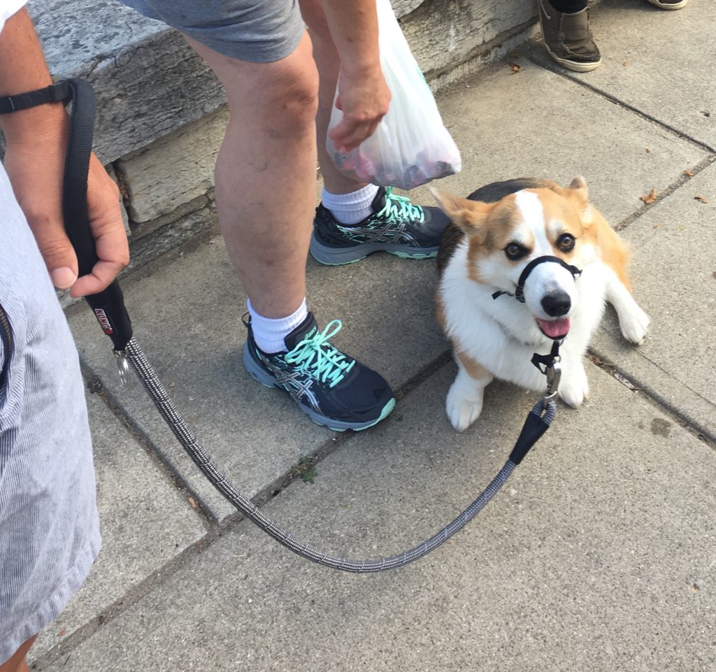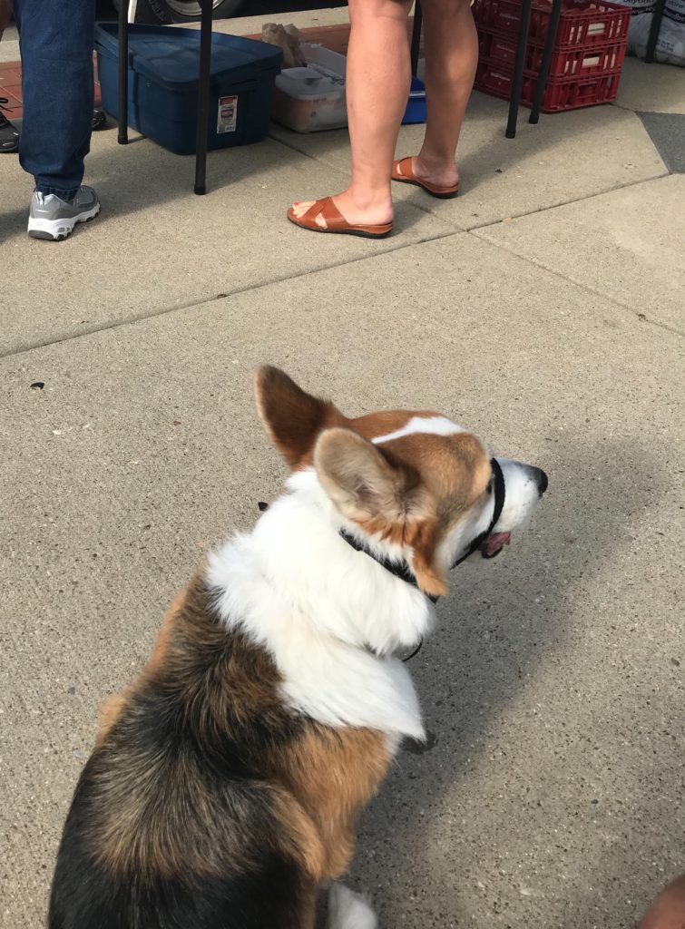 We returned to the farmer’s market this past Saturday and saw improvement on only this second trip. His leash walking for Ben was a cit better, and he was accepting of the attention people love to heap on corgis, whereas the previous weekend he had seemed hesitant, if not shy. The tomato man’s Goldendoddle didn’t bark at Indy this time and they sat calmly on either side of the sidewalk from each other, and Indy felt no need to hide behind Ben’s legs this time around (yay!). Maybe a meet and greet next weekend?