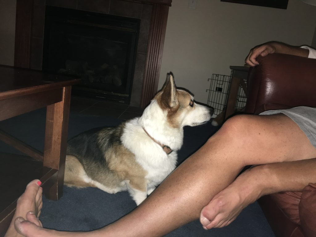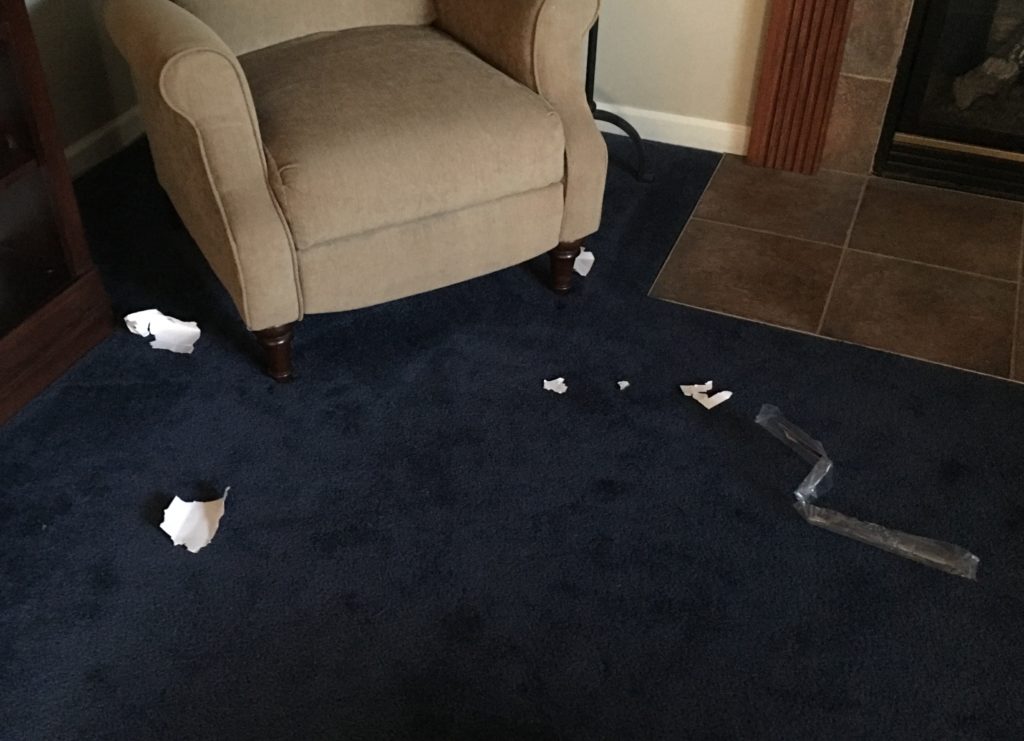 One evening Indy did his first “bad” thing, although that bad thing also showed how smart he is. Ben was snacking on rice crackers and shared a few with Indy before bed. Indy led us up the stairs at bedtime as usual, but he then turned around and went back downstairs. In the 6 or so weeks that we have had him, he has NEVER done this, always waiting for one of us to go down. As it turned out, Ben left the package of crackers on the end table and Indy apparently remembered this. From the sofa he was able to steal the package from the table so he could “treat” himself to the last of the tasty crackers. Naughty, yes, but also fair game I think, so it was hard to be mad at him.